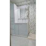 洗面台は間口75㎝の三面鏡+30㎝のトールキャビネットを設置して、収納は抜群に増えました!!