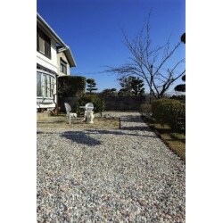 雑草の抑制にはコンクリートを打設するのがよいのですが、コスト・工期共にある程度必要です。 そこで、ご提案させていただいたのが「防草シート」の敷き込みです。 専用のシートを土の上に敷く事で 雑草を抑制します。 完全に雑草が生えてこない訳ではありませんが、コスト・工期が軽減されます。 防犯性も確保したいという事で仕上げに「鳴き砂利」を敷き込みました。