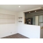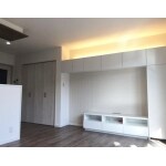 吊戸棚を撤去し、その部分を少しだけ下がり天井にして、空間のアクセントにしました。 腰壁も既存の高さより10センチ高くして、リビングからキッチンのゴチャゴチャが見えないようにしてスッキリ感を出し、照明は全てダウンライトでシンプルに仕上げました。 下にはDVDやゲームなどを収納できるようにして、ペットゲージをすっぽり納めれるようにあえて端に空間を空けました。 エコカラットの作用もありペット臭も気にならないはずです。 テレビボードの横にはクローゼット収納を新設しました。 子供のおもちゃ収納場所としても、キッチンパントリーとしても大活躍してくれると思います。