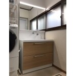排水に問題が生じ、浴室リフォーム工事の後でしたがタイミングよく即工事に入ることができました。今ままでは75cmの間口でしたが、余裕があったので間口90cmをお勧めしました。キャンペーン中ということもあり、除菌水付きで奥様もお喜びです。顔の近くまで引き出せる三面鏡なので、お嬢様のメイクにも活躍しそうな化粧台です。LED照明もスッキリと見やすく設置されています。