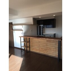 もともと対面式のキッチンですが、流し台周りの間仕切り壁や吊り戸棚は撤去して開口を広くします。カウンターに1枚板を使用。ブラックのアイアン脚で、シャープなかっこいいキッチンを造作します。
