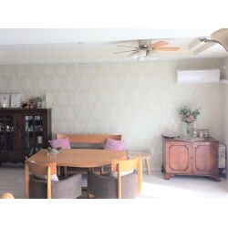 クロスは大きな葉っぱのデザインされた柄をアクセントクロスに選びました。 また、このクロスは、光のあたり具合によって、模様が小さく見えたり大きく見えたりと壁の表情が変化して、とても素敵です。