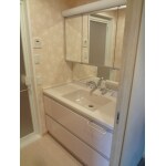 浴室リフォームと一緒に古くなった洗面化粧台の交換をお願いしたい。埋め込み収納を撤去し、三面鏡内に収納をしたい。ピンク色を基本色にご提案頂きたい。 洗面室の壁紙、床クッションフロアの張替も希望。