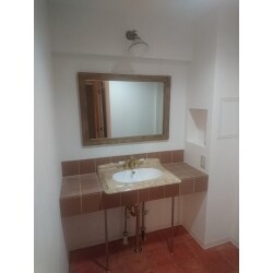 ボーダータイルがおしゃれなアンティーク調の造作洗面台