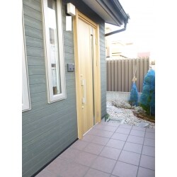 突風により破損してしまった玄関ドア。外壁・内壁をいじることなく施工可能な、工期も1日で可能なリフォーム玄関ドアを採用。以前は木製のドアのため反りで隙間があいたり断熱が良くありませんでしたが、高断熱のドアへ変更し断熱性能もあがりました。