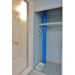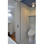 廊下からの入り口にアウトセット引き戸を取付け 個性的な内装材を提案させていだたきました。 モロッコスタイルのクッションフロアとブルーの天井、排水管がばっちり決まりました。