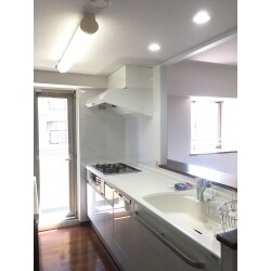 キッチンの吊戸棚を撤去し、開口部を拡張し、オープンキッチンに変更。開放感のあるLDKへ。棚下灯の代わりに天井にダウンライトを新設しました。