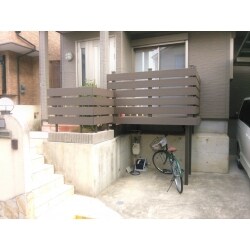 (旧京都建物株式会社(京都建物工務店リフォーム)での事例です。)車を停めるスペースも確保しつつ、ウッドデッキも欲しいとのご要望で、少しでも広いスペースが取れる様、玄関までウッドデッキを伸ばさせていただきました。 玄関横からもウッドデッキに出入り出来る様になり、使い勝手の良さに満足頂いております。 外からの目線が気にならない様、板塀もご提案させていただきました。 プライベート感たっぷりのウッドデッキスペースが出来ました。