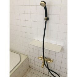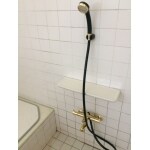 お風呂の扉が透明で浴室内が洗面室から見えるつくりになっているため、洗面の水洗と合った色味をご提案。