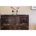 壁はワントーン低い色、そしてキラキラ光るクロスを採用し、ここもまた、ホッとする空間になりました。棚にはKAWAJUNのガラス棚を採用し、モダンな要素を取り入れています。