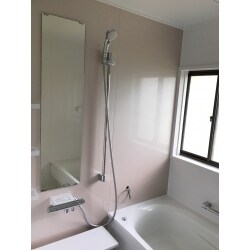 タイルの浴室から、ユニットバスへリフォーム。ピンクのパネルでほんわか暖かな雰囲気です。