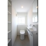 元々、在来の浴室があった場所にトイレを移動しました。 薄暗い印象だった水廻りスペースが明るいトイレへと一新しました。鏡とカウンターを設置し、身だしなみの確認や物が置けるように配慮しました。窓ガラスは網入りガラスから耐熱強化クリアガラスに変更しました。内装は白で統一し、清潔感のある空間としています。