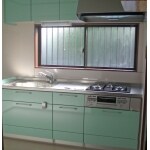 間取り変更により、システムキッチンの設置に必要なスペースを十分に確保することができました。カラーもお料理が楽しくなるような、パステルグリーンです。