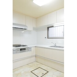コストパフォーマンスの高い、クリナップの「ラクエラ」をご提案しました。 カウンターは人工大理石の白、キッチンパネルも白で統一し、すっきりと清潔感のある仕上がりになりました。 白を基調としていますが、扉柄に薄い色調の木目柄、床のクッションフロアも石目調と、自然素材に模した柄を選ぶことで暖かみのある印象になるように心がけました。 以前は開き戸でしたが、スライド収納にしたことで足元まで収納力が増え、キッチン周りの備品はしっかり収めることが可能になりました。 以前のタイル壁やレンジフードに比べると、キッチンパネルや新型の換気扇でお手入れも簡単になりとても喜んでいただけました。