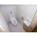 ウォシュレットは一体型なので部品交換ができないため、取替を提案。タンクレストイレと手洗い器の交換で、特に手洗い器は以前のラウンド型ボウルではなく、奥行きの小さいスクエア型のものにしました。タオルかけもついています。