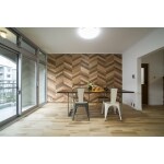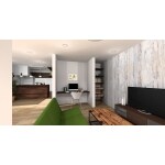 和室の間仕切壁や押入れを撤去して、広々としたLDKとします。 また、リビングの一面の壁は真っ白な壁面のクロスもいいけれど、せっかくのリノべーション、ちょっしたと遊び心があっても良いのではないか、ということでアクセントクロスで貼り分けました。