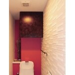 壁の片面にはLIXILのエコカラット [グラナスルドラ]を施工しました。調湿や消臭などの機能があります。 また、背面にはアクセントクロスを施工しました。 アイアン素材の紙巻器とタオルかけ(お客様支給) が空間を引き締めて、グッとオシャレな雰囲気に。 トイレと合わせて収納も造作しました。 濃い木目調のファニチャーのような収納とオレンジ色のアクセントクロスがベストマッチです。