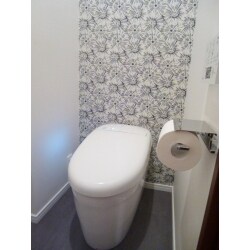 中古のマンションをご購入されたT様。 水廻り設備を中心に、T様お好みのデザインにされたいとリフォームをご検討されていました。 トイレはTOTO ネオレスト・ハイブリットRH2W リモデルタイプにお取替え。 背面にはアクセントで鮮やかなクロスを施工し、 床にはサンゲツの石目調のフロアタイルを貼りました。
