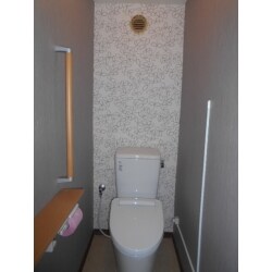 最低限の仕様にしました。 暖房便座、手洗器なし。 高齢者の方が使いやすいように、I型手すりと、体重をかけても大丈夫な、棚付き紙巻器を提案させていただきました。 元々普通便座だったのでコンセントがない場所に、新規でコンセントをつけました。 その際、コンクリート造りなので露出ではわせ、モールで線を覆いました。 壁はモノトーンで落ち着いた雰囲気にして、アクセントとして1面を変えたことで、暗くなりすぎないように仕上がりました。