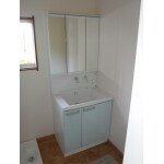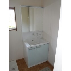 TOTO サクア。化粧鏡は、手元に引き出せ、左右どちらからでも開閉できる便利な両開きの鏡扉。鏡裏はすべて収納スペースで、普段よく使う小物がたっぷり入ります。洗面ボウルも広く、使いやすいと好評です。
