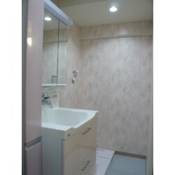 トールキャビネットがついたスライドレール式のキャビネットや3面鏡で収納力を上げて、全体のカラーも奥様がお好きなピンクで統一することで明るい空間になるようご提案しました。 壁付けタイプの洗髪シャワー水栓で清掃性も良く、ボウル部分も大きいので今後の生活の中で多様性のある使い方が出来るものをご提案いたしました。