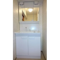 TOTO Vシリーズ。以前はカウンタータイプの洗面台の為、収納が少なく、棚を別に置かれていました。大きな物もしっかり収納できる扉タイプの洗面化粧台に取り替えることで、ゆったり使える洗面所になりました。