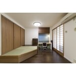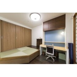 「広いリビング」に対してはダイニングと居間の間の壁を取り、広いリビングダイニングとします。 ダイニングとは小さな開口で繋がっているだけのキッチンは、ダイニング側の吊戸を撤去し天井まで開口とすることで、リビングダイニングと一体の空間とします。 撤去した吊戸の代替えをキッチンの背面上部に新たに取り付け、収納力が落ちないようにします。 居間の押し入れはコートなど長ものが吊るせるようなクローゼットとしますが、その前に「畳が丘」を置いて小上がりの畳スペースを確保します。畳が丘は上部の畳が開閉式になっていて、これを開くと大きな収納になっていて便利です。