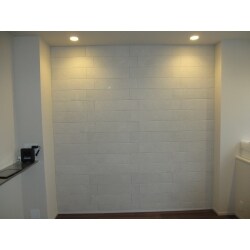 エコカラットは夏場の湿気や冬場の乾燥を調整して快適な湿度を保ってくれます。落ち着いたデザインですのでどんなインテリアにもマッチします。貼り方(パターン)によっても室内のイメージが変わりますので、馬踏み目地を少しアレンジしたパターンで貼らせて頂きました。