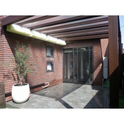 もともとあったタイル・屋根ともサイズを大きくし、屋根には日除けをつけて夏の強い日差しをカットしてくれます。隣地側には目隠しとしてRC杉板調のアートボードを設置しました。