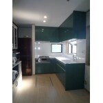 床の色を明るく、システムキッチンを深みのある緑にしたことで、全体的に趣のあるキッチンになりました。またデットスペースになりがちなコーナーにコーナーワゴンを設置し有効活用ができました。