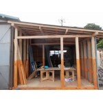 コンクリートでの土台づくり、木材での下地組み、トタン板で壁・屋根貼り、仕上げに雨樋の取付。この道30年以上の大工の腕で仕上げました。