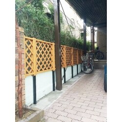 木製のラティスは耐久性に欠ける為、木樹脂ラティスに新規交換致しました。雨にも強く長持ちが期待できます。