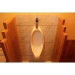 床の清掃性を考慮して壁掛小便器としました。壁も床と同じ石を使っています。