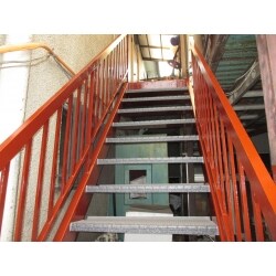 既設は階段から共用廊下に続いておりましたが、 階段部のみを現地でカットし、新規階段を溶接施工するご提案を致しました。 また、踏板がセメント施工から金属に変わりましたので、 防音と滑り止めを目的として、「タキステップ」を併せて施工しました。 その他金属部は現地設置後に上塗りで錆止め塗装を行っております。