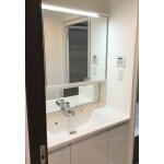 全体的にホワイトで統一した洗面空間になりました。 気にしておられた収納スペースは三面鏡の裏に大容量の収納スペース、さらには掃除用具なども片づけられる洗面下の扉収納があるので機能的にも問題ありません! 洗面スペースも幅の広いものへと交換! とても明るい洗面空間になりました。