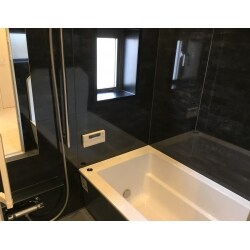 まるで高級ホテルの浴室を思わせる浴室になりました。 上下スライドできるシャワーにし、給湯パネルで機能も充実! バスタブの内側だけをホワイトにし、パネルは全面ブラックにしました。 高級感のあるおしゃれな浴室空間をご希望だったお客さま、とても素敵な浴室空間になり大変お喜びいただけました。