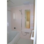 座っても柔らかい床材と、高断熱浴槽。キッチンと合わせたピンクの壁に浴室暖房乾燥機もお付けしました。