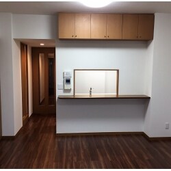 「明るい印象にしたい」のご要望でしたので、壁と床の張替えをおすすめしました。白い壁で広々とした印象に、汚れが目立つ床も、収納棚の色ともマッチする明るいお色をご提案させていただきました。