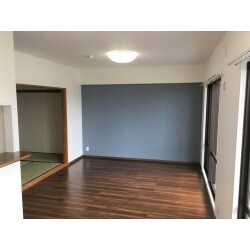 リビングの壁一面をネイビーにし、アクセントとしました。 奥行きが出てリビングが広くみえるようになりました。 明るかったフローリングは濃い木目調へ張り替え。 お洒落でシックな空間のリビングになりました。