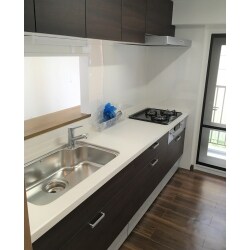 システムキッチンへ交換しました。 キッチン収納は使い勝手の良いすべて引き出しタイプにしました。 お手入れ簡単なシンクへ、表面には水アカがつきにくく美しいまま保つことができます。 ダーク系な色をアクセントに加えるだけでスタイリッシュな空間になりました。
