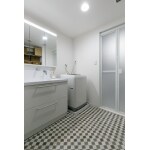 水まわりの動線を変え、洗面へのアクセスをあえて1方向にシンプルにし、洗面スペースの配置を変え、奥行き60cmの収納棚を設置し、使い勝手や収納を充実させました。