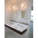 TOTOの新商品【エスクア】でダブルボウルにして渋滞を回避! さらに、モザイクタイルを使用して落ち着きのある空間となりました。 鏡はお客様にお持ちいただいたものを取り付け、ここでもお客様の夢がひとつ叶いました。