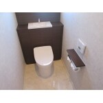 TOTOの【レストパル】を採用させていただきました。タンクが収納されているすっきりしたデザインで、両サイドには収納もできる優れものです。 背面は、レストパルの収納部と合わせた色合いの壁紙をアクセントで貼り、モダンな雰囲気に仕上がりました。