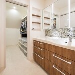 奥様の「ホテルのパウダールームのようにしたい」とのご要望から、パナソニックの『ラシス』をご提案。洗面台の一部に奥様お気に入りのモザイクタイルをあしらい、ラグジュアリーな空間を演出しました。 隣接するクローゼットでの衣装選びもスムーズ。