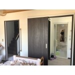 新設する寝室のトイレへのドア(引戸)設置。 洗濯機と洗面台の配置を変える。 床材、壁紙の交換。