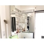 洗面台を窓の前に設置したため、収納キャビネットは左側面に設置。キャビネットの扉裏にも鏡がついているので、洗面台に向かったまま鏡を見ることができます。 トイレへの扉は間口が狭くなってしまうため、寝室につながる出入り口を設けて引戸を設置しました。 また、既存の出入り口も間口を広げました。