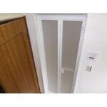 新規のドアも折れ戸を導入しました。洗面所は浴室ドアのある一面だけ壁紙の貼り替え工事を行いました。