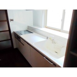 扉やシンク、カウンターのお色を迷われていましたが、最終的にこちらの明るいお色に決めて頂きました。以前よりもキッチンを狭め、電子レンジやポットを収納できる家電ストッカーを設置させて頂きました。