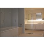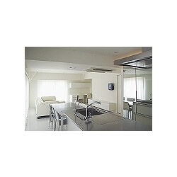 白を基調として清潔感をだし、キッチン裏の収納部分の扉には鏡面仕上げとし、広さを出しました。すっきりとさせる為に、照明関係はほとんどダウンライト・間接照明としました。