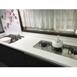 キッチン本体はブラックで、モノトーンのキッチンでシックなので、あまり目立ちすぎないように麻の葉タイルをバランス良く配置しました。また、こちらのキッチンはシンプルながらも収納力が抜群なので、こちらを提案させて頂きました。またアクリル系人造大理石のカウンターなので、キズがつきにくく汚れがついてもお掃除しやすい素材です。
